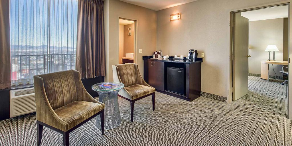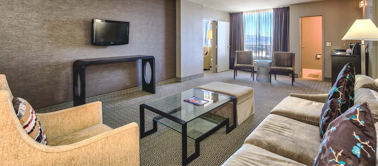 Our one bedroom suites (approximately 650 square feet) come with a living room parlor, a total of 1.5 bathrooms, in-room safe, multiple flat-screen televisions with premium cable channels, mini refrigerator, coffee maker, wet bar and all of our deluxe room amenities. Each bed features luxury bedding with fresh and crisp triple sheeting and select pillows.